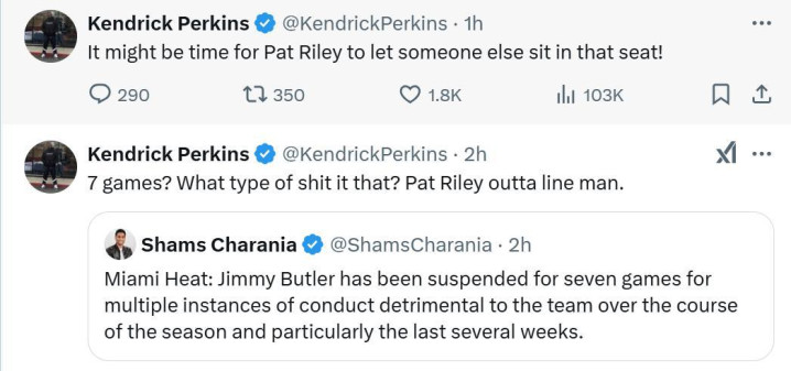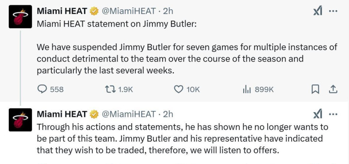 巴特勒和热火的关系在2024年初彻底闹掰了,这事情说起来挺有意思的,一边是那个在总决赛上拼到虚脱的巴特勒,一边是建立了热火文化的莱利,两个硬茬子碰到一起,谁也不让谁。 莱利这个人在NBA混了几十年,对付不听话的球员有一套自己的办法,这次禁赛巴特勒看似简单,实际上算计得很精准,因为巴特勒这赛季已经缺了不少场,再加上这七场禁赛,他想拿奖就必须把剩下的比赛全打完。